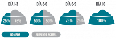 Días Alimento nuevo Alimento anterior 1-3 25% 75% 3-6 50% 50% 6-9 75% 25% 10 100% 0% - Siempre agua limpia y fresca al alcance de su mascota, no olvidar mantener el alimento en un lugar fresco y seco.