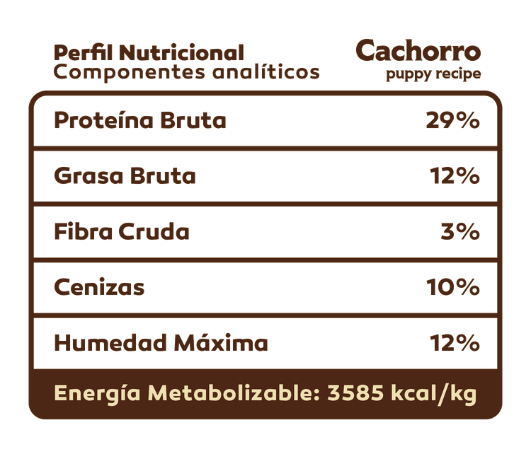 Proteína de Carne Deshidratada Pollo (28%), Proteina de Carne Deshidratada Bovino (12%), maíz, trigo, arroz, aceite de oliva, aceite de pollo, saborizantes hidrolizados de ave, zeolitas, sal, Omega 3 y Omega 6, extracto Yuca Shidigera, probióticos, Mycosorb A+, colorante natural, aromas, saborizantes naturales.